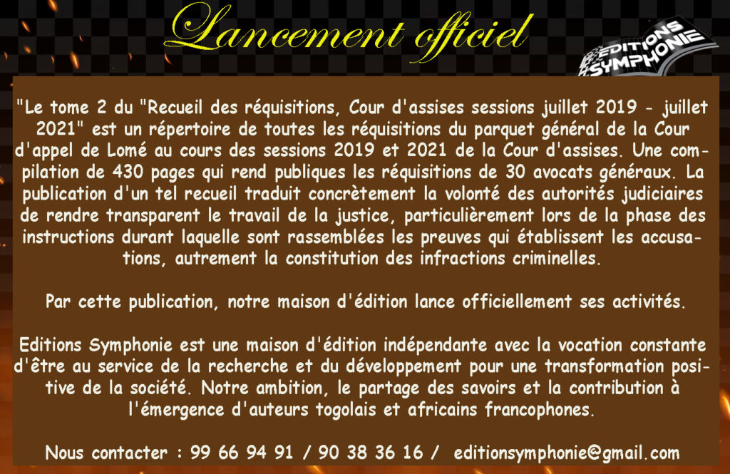 “Après le tome I consacré à la session d’assises de 2018, voici le tome II où sont rassemblées les affaires inscrites au rôle et jugées aux sessions de 2019 et de 2021, ce qui justifie la densité de ce document. Cette publication vient relever le défi de la pérennité de cette initiative qui consiste à exposer au grand jour, pour un motif d’intérêt public, d’ordre pédagogique, informatif, le travail du parquet dans son ensemble et celui des avocats généraux particulièrement, dans une procédure où ces derniers sont appelés à représenter les intérêts de la société devant la cour d’assises, à proposer une peine pour l’accusé ou à demander son acquittement“, lit-on dans l’avant-propos signé Kodjo Gnambi Garba, ex-procureur général près la Cour d’appel de Lomé, qui a dirigé les travaux du recueil avant de passer le relais à son successeur pour la finalisation du document.