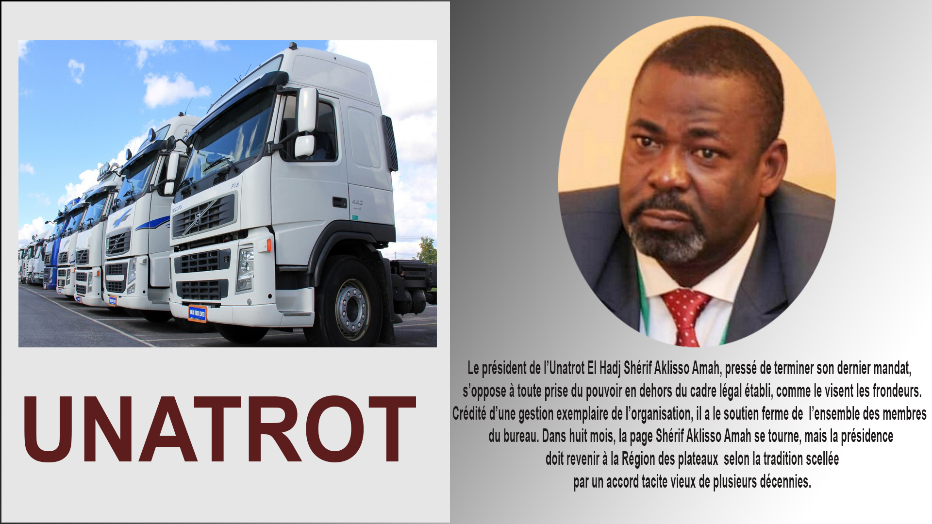Le bureau exécutif de l’UNATROT est bien soudé autour de son président El Hadj Shérif Aklisso Amah. Les agitateurs qui se donnent des moyens illégaux pour semer le trouble ne jouissent d’aucune légitimité. Toutes les allégations proférées pour dénoncer la mauvaise gestion de l’organisation relèvent, d’après les réalités, de l’affabulation, et sont sous-jacentes à des visées électoralistes. Le groupuscule de protestataires dénonce deux choses fondamentalement, la non reddition des comptes, la non organisation de congrès, et réclame la modification des textes.